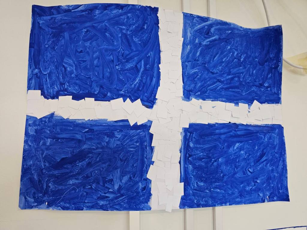 Гръцкото знаме, изработено от деца в 13-та предучилищна група 3, Глифада, Гърция